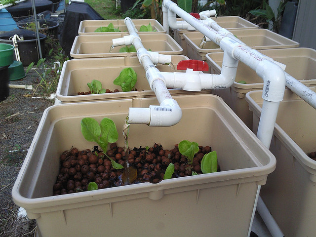 A homemade system using deep plastic tubs as flood and drain containers, combined with PVC tubing and joints to deliver the nutrient solution. Note that the tubs are half-filled with hydroton as a growing medium. These young lettuce plants will have plenty of root depth while also having some protection from wind thanks to the tub walls. Also note that each side of the irrigation system has a separate valve which can turn that side on or off. This allows half the system to be in operation while the other half is down for harvesting, replanting or maintenance. When designing your own system, include a variety of shutoff points like this to help make maintenance easier.